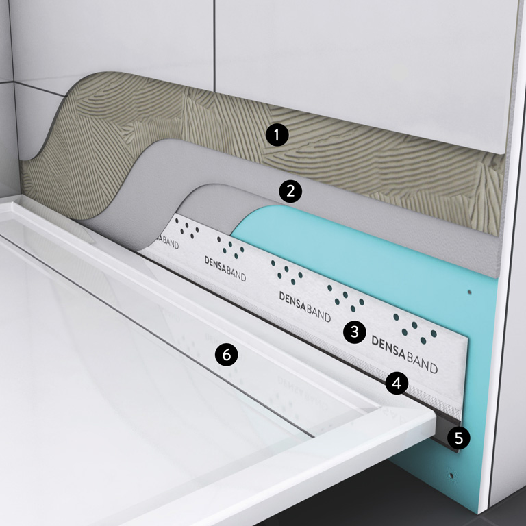 Das DENSABAND SCHNITTFEST ist besonders dünn sowie flexibel und dabei dennoch absolut dicht. Es lässt sich sehr leicht in die Wandabdichtung einbetten. Ein weiterer großer Vorteil: Zur Befestigung ist keine Klebeschicht notwendig, die bei Druck auf darüber liegende Fliesen zur Wand hin eingedrückt werden könnte – so besteht auch nicht die Gefahr, dass Fliesen brechen könnten (z.B. beim Anschrauben rahmenloser Grennwände).